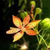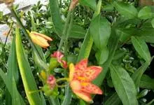 射干 Redouté)是鸢尾科射干属多年生草本植物。根状茎为不规则的块状,斜黄色或黄褐色;花橙红色,散生紫褐色的斑点;花药呈条形;子房下位,倒卵形;蒴果倒卵形或长椭圆形;种子圆球形,黑紫色,有光泽。…全部>>