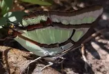 大二尾蛱蝶两翅正面黑色,中域有一浅绿色大型宽带纹,两翅反面浅绿色,中域有一缀黑边的褐色弧纹,亚外缘还有一深褐色横纹,后翅各有尾突两条,…全部>>
