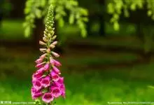 毛地黄是车前科、毛地黄属一年生或多年生草本植物。株高0.5—1米,茎直立,少分枝,全株被灰白色短柔毛和腺毛叶基生,呈莲座状,卵圆形或卵状披针形。顶生总状花序,花冠钟状,紫红色,内面有浅白斑点。菊果卵形。…全部>>