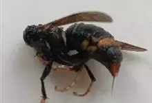 金环胡蜂是胡蜂科、胡蜂属昆虫。雌蜂体长约40毫米,工蜂体长25毫米,雌蜂体黑褐色,头部橙黄色,额片前缘弓形,中央凹,两边突出;触角12节,膝状,暗褐色;中胸背部中央有很细纵沟;翅膜质半透明,…全部>>