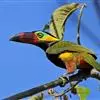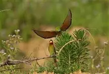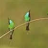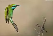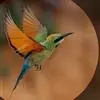 栗喉蜂虎是蜂虎科蜂虎属的鸟类。有热带鸟类羽毛艳丽的特征:喉部是栗红色的,黑色的过眼纹,翅膀和背部是绿色的,尾翼是蓝色的,飞行时翅膀下面的羽毛是橙黄色的,在阳光的照射下,它们全身闪烁着金属般的艳丽光泽,…全部>>