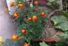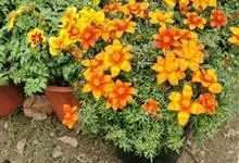 万寿菊是菊科万寿菊属一年生草本植物,别名孔雀菊、缎子花、臭菊花、西番菊、红黄草、小万寿菊、臭芙蓉、孔雀草。万寿菊茎近基部分枝。叶羽状分裂,长5-10厘米,宽4-8厘米,裂片长椭圆形或披针形,具锐齿,…全部>>