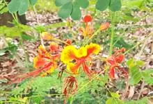 洋金凤 Sw.),豆科小凤花属灌木状或小乔木植物,枝无毛,绿或粉绿色;二回羽状复叶;总状花序伞房状,萼片无毛,花瓣橙红或黄色,圆形,花丝红色,子房无毛,花柱橙黄色;荚果窄而薄,…全部>>