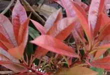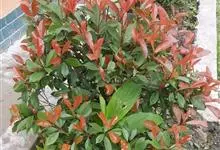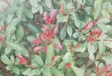 红叶石楠 是蔷薇科,石楠属杂交种,为常绿小乔木或灌木,乔木高可达5米、灌木高可达2米。叶片革质,长圆形至倒卵状、披针形,叶端渐尖,叶基楔形,叶缘有带腺的锯齿,花多而密,复伞房花序,花白色,梨果黄红色,…全部>>