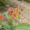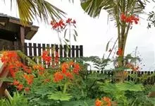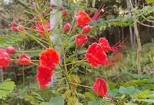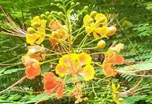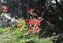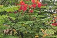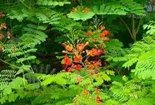 洋金凤 Sw.),豆科小凤花属灌木状或小乔木植物,枝无毛,绿或粉绿色;二回羽状复叶;总状花序伞房状,萼片无毛,花瓣橙红或黄色,圆形,花丝红色,子房无毛,花柱橙黄色;荚果窄而薄,…全部>>