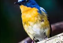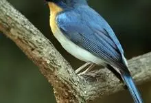 山蓝仙鹟:小型鸟类,体长13-15厘米。雄鸟额基和眼先黑色,颏橙棕色,仅颏尖为蓝黑色,喉、胸、上腹和两胁亦为橙棕色,下体白色范围较小,仅局限于下腹和尾下覆羽。雌鸟上体少黄色,颏、喉、胸概为锈红色,…全部>>