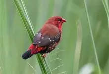红梅花雀小型鸟类,体长9-10厘米。雄鸟通体朱红色,背、肩、胸等满布白色小斑点,两翅和尾黑褐色均具白色端斑,嘴红色,脚蜡黄色。雌鸟上体淡褐色或赭褐色,翅上中覆羽、大覆羽和内侧飞羽末端具白色斑点,…全部>>