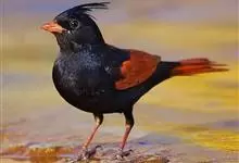 凤头鹀:属小型鸣禽,体重21-31克,体长134-175毫米。以头顶的细长羽冠为特征,雄鸟全身几乎均为黑色具蓝色光泽,两翅和尾以及尾上覆羽栗红色。雌鸟具短的褐色羽冠,上体暗橄榄褐色,…全部>>