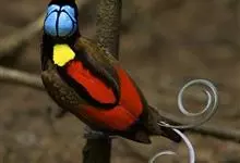 大极乐鸟是极乐鸟属中最大的鸟种。成年雄鸟体长可达到43厘米,雌性可达35厘米。雄鸟的额、颊、喉等墨绿色;头、颈黄色;上体暗赤栗色;腹部葡萄红色,胁部有长饰羽,其基部橙黄,中部黄色,…全部>>