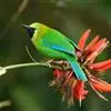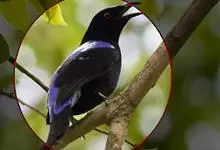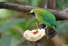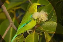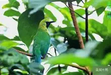 蓝翅叶鹎:小型鸟类,体长15-18厘米。雄鸟通体草绿色,尾蓝绿色,肩和翅亮蓝 色,胸缀有黄色,颏、喉黑色。雌鸟颏,喉蓝绿色。栖息在海拔1500米以下的常绿阔叶林、次生林和林缘疏林灌丛中。…全部>>