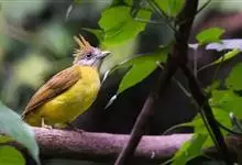 黄腹冠鹎:体长19-24厘米,是一种体型略大的褐色鹎。头顶橄榄褐色具黑褐色羽冠。白色的喉膨起,下体黄色。似白喉冠鹎但较鲜亮,上体褐色较重,腹部为鲜亮的柠檬黄色。虹膜褐色;嘴黑色;脚粉红色。…全部>>