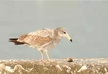 灰翅鸥,夏羽头、颈、腰、尾白色;肩、背和翅上覆羽鸽灰色。冬羽和夏羽相似,但头和颈具淡褐色纵纹,有时扩展至上胸。嘴黄色,下嘴先端具红斑;幼鸟嘴黑色。脚粉红色。栖息于海岸:悬岩,海滨沙滩于近海海岛上。常…全部>>