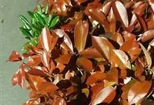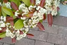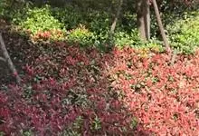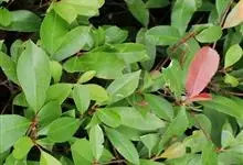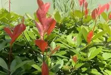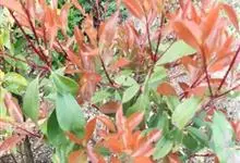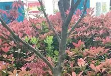 红叶石楠 是蔷薇科,石楠属杂交种,为常绿小乔木或灌木,乔木高可达5米、灌木高可达2米。叶片革质,长圆形至倒卵状、披针形,叶端渐尖,叶基楔形,叶缘有带腺的锯齿,花多而密,复伞房花序,花白色,梨果黄红色,…全部>>