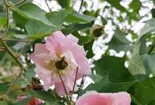 木芙蓉,锦葵科木槿属落叶灌木或小乔木。小枝上有细绒毛;叶片为卵状心形,托叶为披针形,常早落;花单生,花萼为钟形,花冠初为白色或淡红色,后逐渐变为深红色;果实为扁球形,有淡黄色的毛附着。花期8到10月。…全部>>