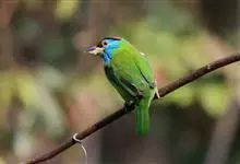 黑眉拟啄木鸟,为须䴕科、拟啄木鸟属的小型鸟类,体长20-25厘米,外形和金喉拟啄木鸟非常相似,但具粗著的黑色眉纹,头侧和耳覆羽以及下喉蓝色而不为银灰色,前颈两侧各有一块鲜红色斑。全部>>