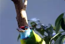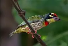 金喉拟啄木鸟,是须鴷科、拟啄木鸟属的鸟类。金喉拟啄木鸟为小型鸟类,体长19-24厘米。额深红色,头顶金黄色,后枕具一大块深红色斑,耳羽和头侧银灰色,上体草绿色,颏和上喉金黄色,下喉淡银灰色,…全部>>