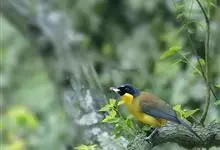 黄喉噪鹛体型略小,顶冠蓝灰色,特征为具黑色的眼罩和鲜黄色的喉。上体褐色,尾端黑色而具白色边缘,腹部及尾下覆羽皮黄色而渐变成白色。黄喉噪鹛隐匿于亚热带常绿林和浓密灌丛,于地面杂物中取食,喜食昆虫,…全部>>