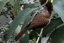 条纹噪鹛是画眉科、噪鹛属中型鸟类,体长28-32厘米。头具短的羽冠,上体栗褐色,飞羽外翻蓝灰色。下体棕栗色,腹以后转为褐白色。除飞羽和尾羽外,所有上、下体羽均具白色羽干纹。极为醒目。野外特征明显,…全部>>
