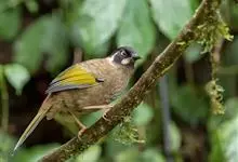 黑顶噪鹛:中型鸟类,体长24-26厘米。前额、脸、颏、喉黑色,头顶黑褐沾棕或深棕橄榄褐色,背栗褐或棕褐色,颧斑白色或棕红色,眼后缘和颈侧亦具白斑,飞羽金黄橄榄色而具蓝灰色尖端。下体淡棕褐色。…全部>>