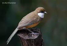 白喉噪鹛中型鸟类,体长26~30厘米。前额或整个头顶棕栗色,其余上体橄榄褐色。颏、喉白色,胸具橄榄褐色横带,腹辉棕色或棕白色。外侧四对尾羽具宽阔的白色端斑。指名亚种的额呈棕色,…全部>>