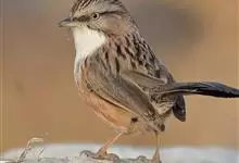 纹喉凤鹛:小型鸟类,体长13-16厘米。头顶和羽冠暗褐色或褐灰色,上体橄榄褐色,飞羽黑褐色,外侧次级飞羽表面橙黄色,构成一块纵形翼斑,极为醒目。颏、喉淡棕白色,具黑色纵纹,腹和尾下覆羽橙黄色。…全部>>