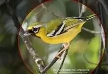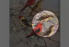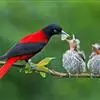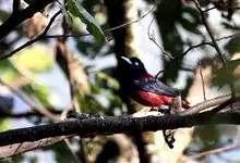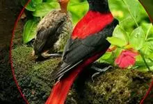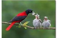 朱鹂:中等鸟类,体长23-28厘米。雄鸟绛紫红色,头、上胸及翼黑色。雌鸟上背及背部深灰色,尾覆羽及尾绛紫红色,腹部及下胸白而密布黑色纵纹。与鹊色鹂幼鸟的区别在上背灰色较深,下体白色较少且纵纹较粗。…全部>>