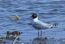 黑嘴鸥 中型水鸟,体长31~39厘米。嘴黑色,脚红色。夏羽头黑色,眼上和眼 下具白色星月形斑,在黑色的头上极为醒目。颈、腰、尾上覆羽、尾和下体白色。初级飞羽末端具黑色斑点。翼下仅部分初级飞羽黑色,与…全部>>