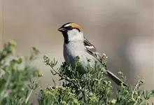黑顶麻雀:为雀科麻雀属的鸟类。体重24-35克,体长144-167毫米,是一种中等体型的麻雀。繁殖期雄鸟头顶有黑色的冠顶纹至颈背,眼纹及颏黑,眉纹及枕侧棕褐,脸颊浅灰。上体褐色而密布黑色纵纹。…全部>>