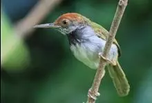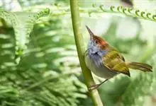 黑喉缝叶莺:体长11.5厘米,是一种小型的顶冠棕色、腹部白色的莺。尾甚长而常上翘,臀黄色,具特征性的偏黑色喉,上体橄榄绿色,头侧灰色。雌鸟色暗,头少红色且喉少黑色。与长尾缝叶莺的区别在后顶冠亦为棕色,…全部>>