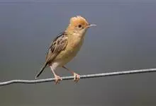 金头扇尾莺体小而具褐色纵纹的莺。嘴细长,略向下弯;翼短,体型娇小,尾长。下体皮黄,喉近白,尾深褐,尾端皮黄。雌雄羽色相近,羽色单调。繁殖期雄鸟顶冠亮金色,腰褐色。雌鸟及非繁殖期雄鸟头顶密布黑色细纹,…全部>>