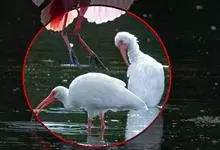 美洲白鹮:是一种大型涉禽。体长56-58厘米,体重750-1050克。头和颈裸出,喙很长,向下弯曲。飞行时颈和脚伸直,交替地拍动翅膀和滑翔。成年美洲白鹮,除了嘴和腿部是橘红色,翅膀末端有黑色外,…全部>>