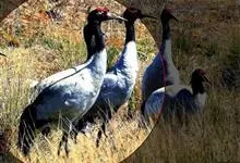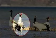 黑颈鹤:是鹤科、鹤属的大型涉禽,体长110-120厘米,体重4-6千克。颈、脚甚长,通体羽毛灰白色,头部、前颈及飞羽黑色,眼先和头顶前方裸露的皮肤呈暗红色,尾羽褐黑色。头顶,三级飞羽的羽片分散,…全部>>
