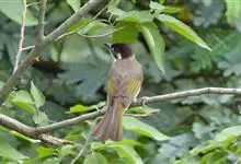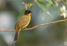 黑头鹎:体长17厘米。是一种中等体型的偏黄色鹎。特征为头辉黑、喉黑而眼蓝。上体黄橄榄色;两翼及尾偏黑,具明显的黄色尾端;下体绿黄色。另一罕见色型为灰色,尾缘白色。与黑冠黄鹎的区别在无羽冠且尾端黄色。…全部>>