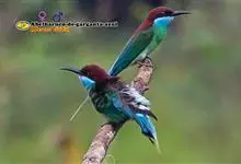 蓝喉蜂是蜂虎科蜂虎属鸟类。体长26-28厘米,嘴长而弯曲,有明显细长的中央尾羽。头部、颈部和背部为巧克力色,有黑色眼纹。喉部、腰部和尾羽为蓝色。腹部和两翼为绿色。幼鸟外观似成鸟,头部、颈部和背部为绿色,…全部>>