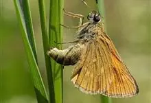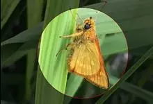 姜弄蝶 Udaspes folus ,又叫银斑姜蝶。幼虫吐丝粘叶成苞,隐藏其中取食,受害叶呈缺刻或在1/3处断落,…全部>>