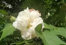 木芙蓉,锦葵科木槿属落叶灌木或小乔木。小枝上有细绒毛;叶片为卵状心形,托叶为披针形,常早落;花单生,花萼为钟形,花冠初为白色或淡红色,后逐渐变为深红色;果实为扁球形,有淡黄色的毛附着。花期8到10月。…全部>>