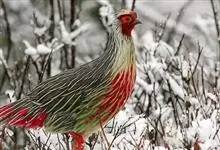 红腹角雉属于鸡形目雉科,雄鸟体羽及两翅主要为深栗红色,满布具黑缘的灰色眼状斑,下体灰斑大而色浅。雌鸟上体灰褐色,下体淡黄色,杂以黑、棕、白斑。全部>>