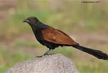 褐翅鸦鹃,是鹃形目鸦鹃科鸦鹃属的鸟类。褐翅鸦鹃的身体为黑色;头颈和胸带蓝紫色金属光泽并具黑亮的羽干纹,下胸至腹部泛金属绿光泽;两翼和肩部为棕栗色,外侧飞羽具暗色羽端,尾羽闪铜绿色光泽;虹膜赤红色,…全部>>