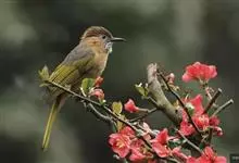 灰短脚鹎,体长19-22厘米。头顶和短的羽冠黑色,上体暗灰色,耳羽灰褐色,两翅表面橄榄绿黄色。大覆羽和内侧飞羽外翈橄榄黄色,在翅上形成大块绿黄色斑,在灰色的上体极为醒目。尾暗褐色具橄榄绿色羽缘。…全部>>