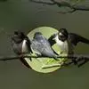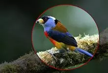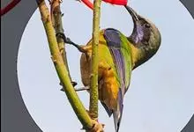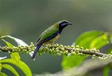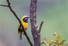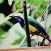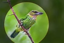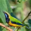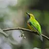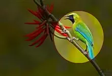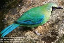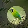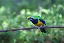 蓝翅叶鹎:小型鸟类,体长15-18厘米。雄鸟通体草绿色,尾蓝绿色,肩和翅亮蓝 色,胸缀有黄色,颏、喉黑色。雌鸟颏,喉蓝绿色。栖息在海拔1500米以下的常绿阔叶林、次生林和林缘疏林灌丛中。…全部>>