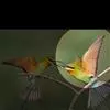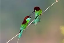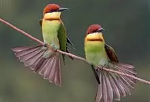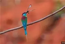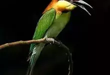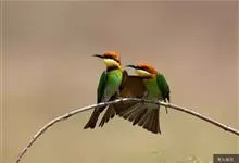 栗喉蜂虎是蜂虎科蜂虎属的鸟类。有热带鸟类羽毛艳丽的特征:喉部是栗红色的,黑色的过眼纹,翅膀和背部是绿色的,尾翼是蓝色的,飞行时翅膀下面的羽毛是橙黄色的,在阳光的照射下,它们全身闪烁着金属般的艳丽光泽,…全部>>