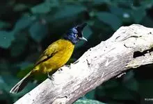 黑冠黄鹎:体长18-21厘米,是一种中等体型偏黄色鹎。整个头、颈、颏、喉黑色,头顶有显著直立的羽冠,黑色,上体褐橄榄黄绿色,下体橄榄黄色。虹膜偏红;嘴及脚黑色。…全部>>