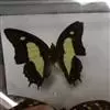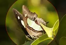 大二尾蛱蝶两翅正面黑色,中域有一浅绿色大型宽带纹,两翅反面浅绿色,中域有一缀黑边的褐色弧纹,亚外缘还有一深褐色横纹,后翅各有尾突两条,…全部>>
