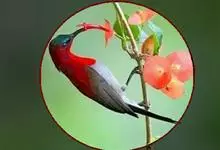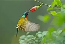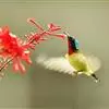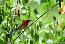 叉尾太阳鸟,雀形目太阳鸟科太阳鸟属留鸟;为小型鸟类,雄鸟头顶辉蓝绿色,上体橄榄绿色,腰明黄色,中央尾羽亮翠蓝色,羽轴针状延长,外侧尾羽黑色具白色端斑,头侧黑色,颜、喉和胸为绛红色,…全部>>