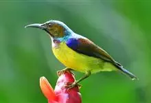 黄腰太阳鸟共有16个亚种,小型鸟类,体长10-15厘米。嘴细长而向下弯曲,雄鸟额和头顶前部金属绿色,头顶后部橄榄褐色。其余头、颈、背、肩、颏、喉、胸以及翅上中覆羽和小覆羽概为红色,腰黄色,…全部>>