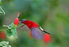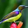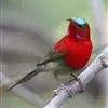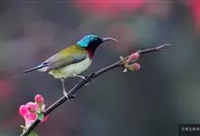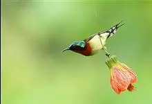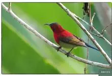 叉尾太阳鸟,雀形目太阳鸟科太阳鸟属留鸟;为小型鸟类,雄鸟头顶辉蓝绿色,上体橄榄绿色,腰明黄色,中央尾羽亮翠蓝色,羽轴针状延长,外侧尾羽黑色具白色端斑,头侧黑色,颜、喉和胸为绛红色,…全部>>