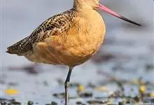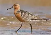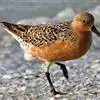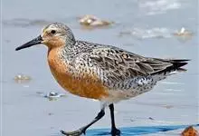 红腹滨鹬,是鹬科、滨鹬属的小型涉禽,体长23-25厘米,嘴较短而直、黑色,脚亦甚短、绿色。体较粗胖。夏季上体灰褐色具黑色中央纹,背具棕栗色和白色斑纹和羽缘,头侧和整个下体栗红色。冬季棕红色消失,…全部>>