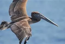 褐鹈鹕:是鹈鹕家族中体型最小的成员。体型粗大,体重6.5-9千克。嘴形宽大直长,上嘴尖端朝下弯曲,呈钩状;下嘴分左右二支,其间有一巨大而能扩缩的皮肤喉囊;鼻孔小,而位于嘴基。眼前部裸出。颈长而较细小…全部>>