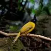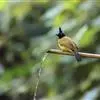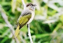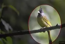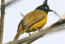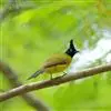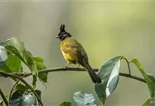 黑冠黄鹎:体长18-21厘米,是一种中等体型偏黄色鹎。整个头、颈、颏、喉黑色,头顶有显著直立的羽冠,黑色,上体褐橄榄黄绿色,下体橄榄黄色。虹膜偏红;嘴及脚黑色。…全部>>