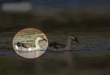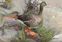 灰雁:体长70-90厘米,翼展147-182厘米,体重2.5-4千克,寿命17年。体大而肥胖。嘴、脚肉色,上体灰褐色,下体污白色,飞行时双翼拍打用力,振翅频率高。脖子较长。腿位于身体的中心支点,…全部>>